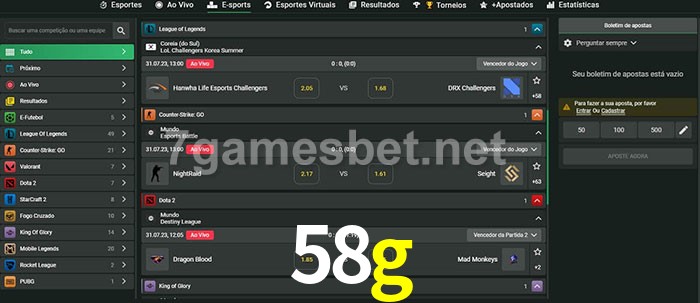 O 58g oferece uma grande seleção de opções de apostas em e-sports com probabilidades competitivas
